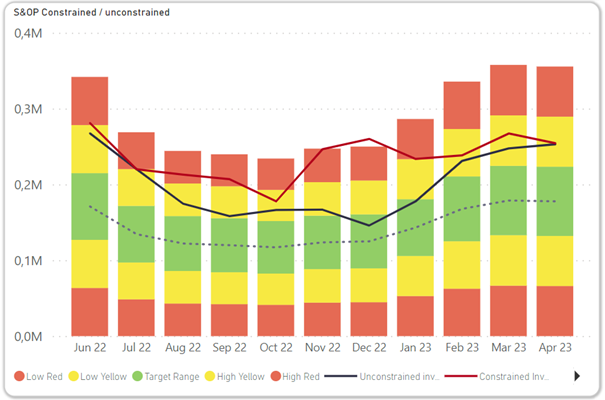Visibility is obtained through the digital platform that aggregates data from transactional systems, supports simulations and allows intuitive visualization to facilitate decision-making. As an example, the graph below shows a scenario for a product family whose production capacity would be saturated at the beginning of 2023. The finite capacity scenario proposes to pull ahead some workload (red projected stock curve). The investment in stock, the impact on lead times and the difference with respect to the scenario where capacity is increased are shown in direct readout. This view is constantly updated according to demand scenarios and upstream constraints and allows for informed decision-making. The trade-off is easy: having 60% more inventory at the end of the year versus having 10% more capacity in the first quarter of 2023.