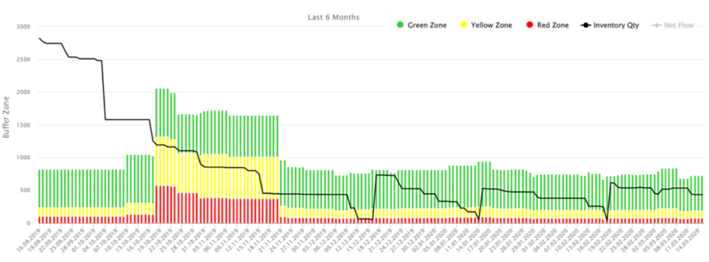 Overstocks were digitized in the system, down to each SKU so it allowed us to estimate the quantity of items with the excess stock, their cost, and the percentage over the buffer for each part. Visual reflection of the SKU history in dynamics showed periods of time where stock level didn’t enter the buffer from delivery to delivery.