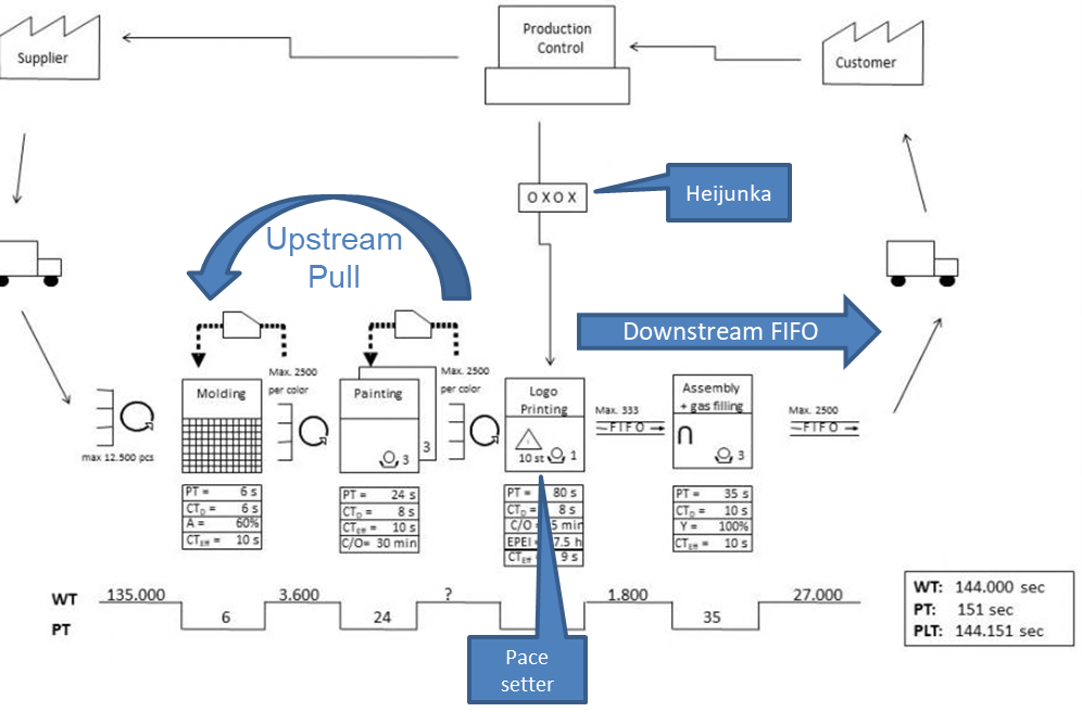 A Heijunka pilots the pacesetter station (sometimes called pacemaker, constraint) for a given flow, and the flow is pulled upstream of this pacesetter station. Downstream of this pacesetter station, there will generally be a sequence of FIFO operations.