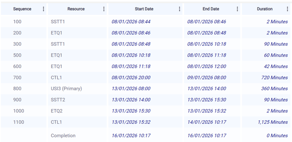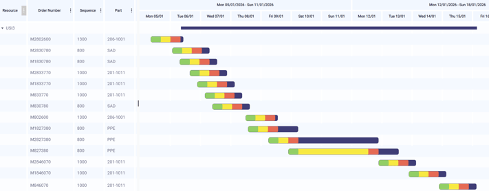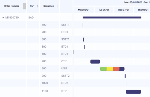 Let's take the example below. Your magic algorithm has determined that operation 700 will start on January 8 at 8 p.m. and end on January 9 at 8 a.m. What are the chances of this happening? Probably zero—because the actual operation times and setup times for this work order and other orders that go through the same resources will not exactly match the planned routings times.