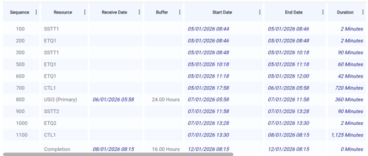 Since our scheduling is roughly correct but not precise, we will insert time buffers—safety nets—at key stages. In our example, we insert a 24-hour buffer at operation 700 and a 16-hour buffer at the end of the work order.