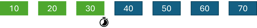 The image is a number line with the numbers 10, 20, 30, 40, 50, 60, and 70 marked on it. Each number is inside a blue rectangle placed above the number line, which is marked in black with the numbers aligned horizontally in ascending order. In the middle of the number line, between 30 and 40, there is a small rectangular strip divided into three colored sections: green, yellow, and red, from left to right. There is a similar small rectangular strip with the same color pattern placed after the number 70.