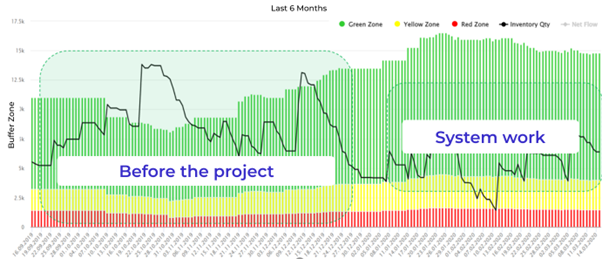 Los excesos de existencias se digitalizaron en el sistema, hasta cada SKU, por lo que nos permitió estimar la cantidad de artículos con exceso de existencias, su coste y el porcentaje sobre el buffer de cada SKU. El análisis dinámico del historial de SKU mostraba períodos de tiempo en los que el nivel de stock ni siquiera entraba en el buffer.