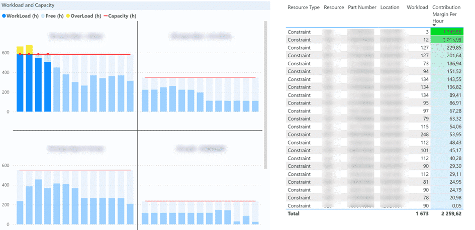 Veamos un ejemplo de la vida real, en un pool de máquinas con limitaciones, tal y como lo visualiza Intuiflow: para los próximos 4 periodos en este pool de máquinas, tengo productos que me generan más de 1.000 euros por hora, pero que no representan una gran carga, por lo que me aseguraré de no dejarlos de lado…