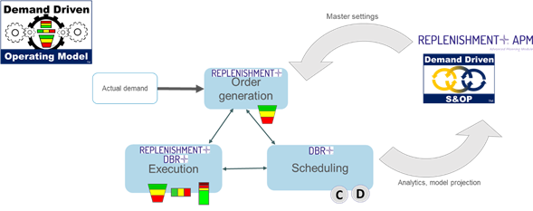 Antes de llamarse DDMRP el modelo se llamaba «reposición activamente sincronizada». Se trata de dar a los equipos las señales para actuar: hacer un pedido, acelerar un pedido en curso, añadir personal a una estación, ralentizar un proceso para evitar generar atascos, etc.
