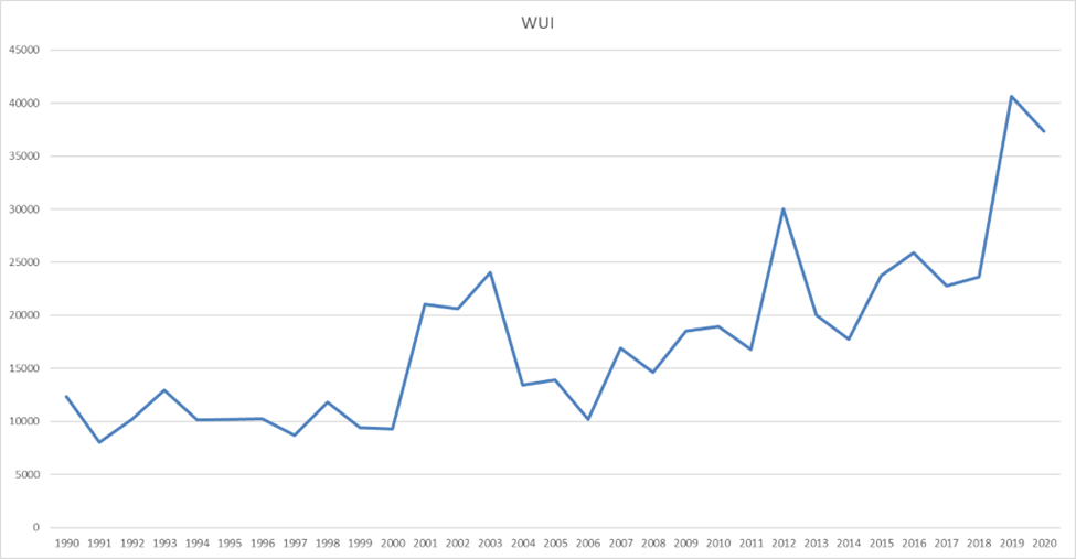 Le World Uncertainty Index mesure la récurrence du terme « uncertainty » et de ses synonymes dans les rapports de l’Economist Intelligence Unit.