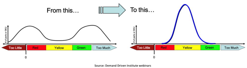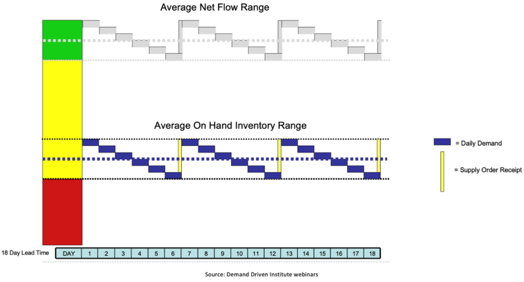 Au bas de la zone jaune, le flux physique fluctuera de la taille de la zone verte (fourchette de stock disponible moyen). Ainsi, le système est initialement configuré pour ne permettre ni les ruptures de stock ni les surstocks. L'utilisation d'un buffer selon cette méthodologie aide tous les maillons de la supply chain à couvrir les problèmes liés à l'augmentation des ventes et à répondre à temps aux baisses de la demande. Elle permet également d'équilibrer les commandes, de les rendre régulières.