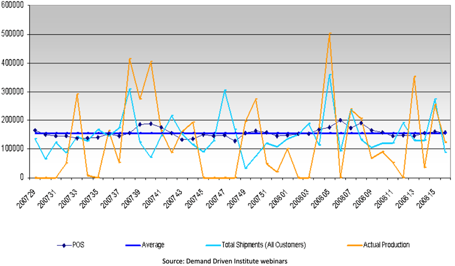 Entre les ventes de détail (POS) et la production, la distorsion est énorme. Un niveau de stock élevé est nécessaire pour atténuer les problèmes aigus et créer une illusion de fiabilité. Mais cela ne résout pas le problème des fluctuations des stocks, qui passent de niveaux artificiellement élevés à des pénuries, puisque c'est une conséquence naturelle de la planification sur la base d'informations déformées.