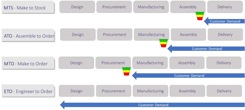 Dans chacune de ces typologies de flux, à l’exception de l’ETO (Conception à la commande), la demande client remonte dans la supply chain jusqu’à un point de découplage, c’est-à-dire jusqu’à un stock conçu pour être disponible et répondre aux attentes de délai des clients.