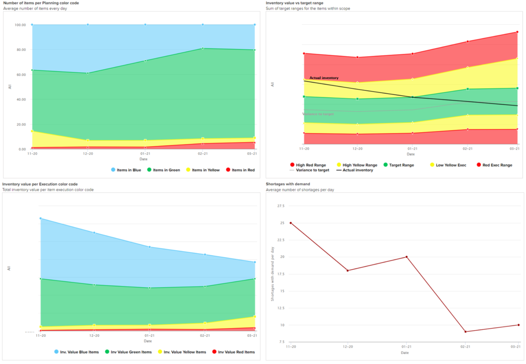Voyons un exemple sur la performance passée : extrait d’un tableau de bord agrégé, ici au niveau d’une usine, qui comprend plusieurs visuels synthétiques en maille mensuelle. Il permet à une équipe de management de juger de la progression globale de la performance, et d’identifier les dérives. Au premier coup d’œil on voit ce qui se passe : en quelques mois on a une valeur de stock en baisse, des ruptures en baisse et moins d’articles avec un stock trop haut ou trop bas.