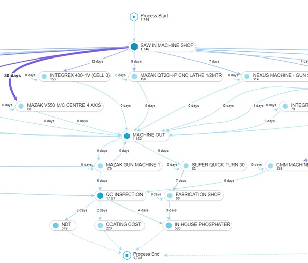 Ces outils de process mining vont aussi vous aider à identifier les variantes de flux en détectant les variantes et analogies. Par exemple certains flux partagent la même contrainte primaire, certains comprennent plusieurs passages sur la même contrainte primaire, ou sollicitent plus d’une contrainte.