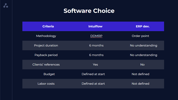 En raison des incertitudes et des risques liés à l’auto-développement, il était avantageux d’acquérir le système automatisé de gestion des stocks. L’offre ABM Cloud a été convaincante grâce à la mise en œuvre réussie de la solution Intuiflow et de la méthodologie DDMRP dans des entreprises similaires. Les représentants de Fast Pack ont pu obtenir des commentaires des clients aBM Cloud, entendre les opinions de première main et les recommandations des utilisateurs.
